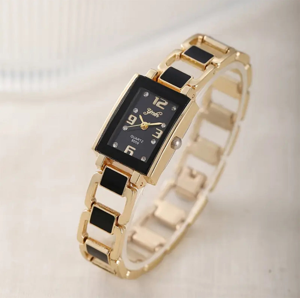 Elevate your style with this elegant golden watch featuring a black crystal-studded dial. A perfect blend of luxury and function, ideal for formal wear or statement accessorizing.