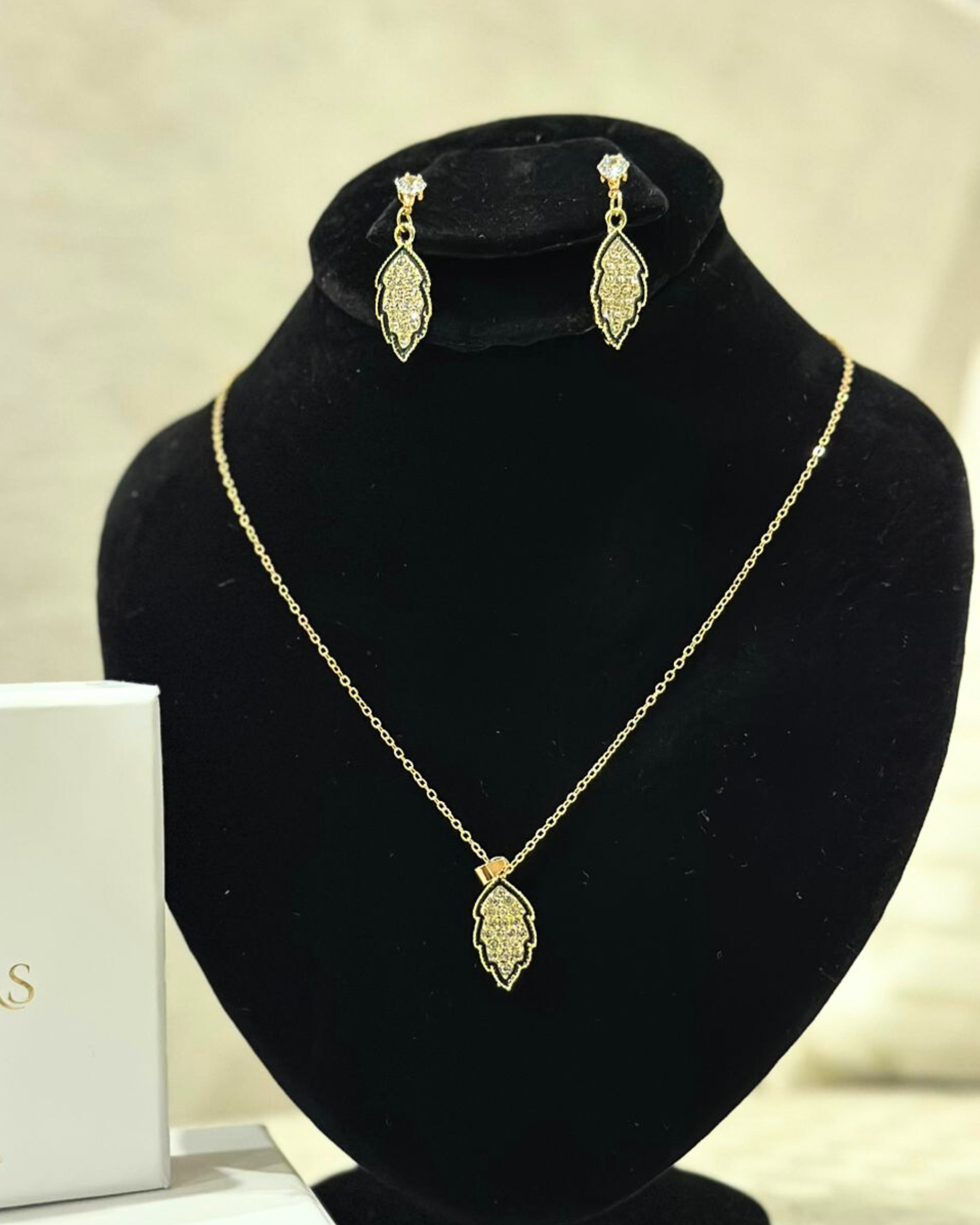Embrace nature-inspired elegance with our Golden Leaf Design Pendant Set. Featuring intricate leaf detailing in a radiant gold finish — perfect for everyday wear or special occasions.