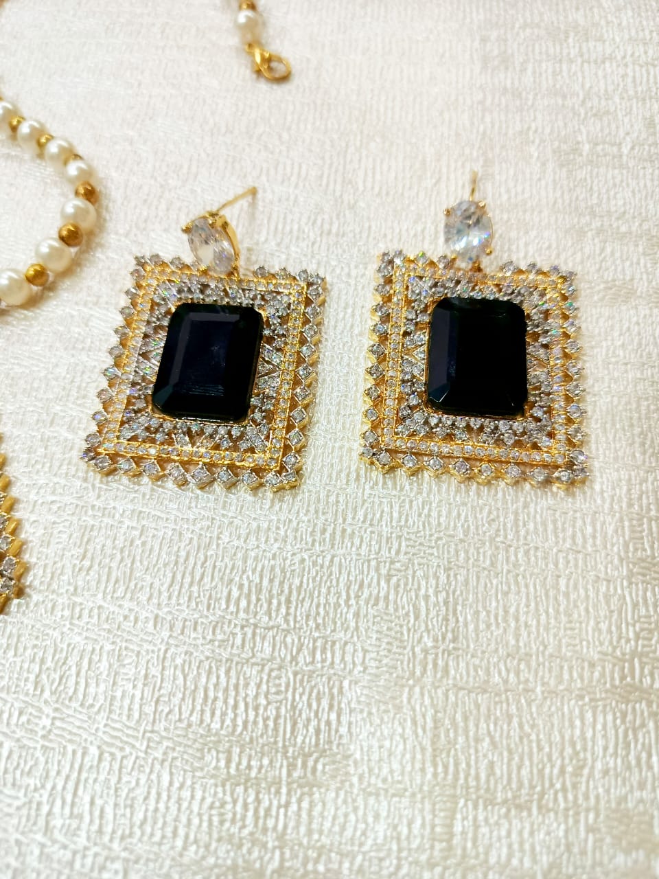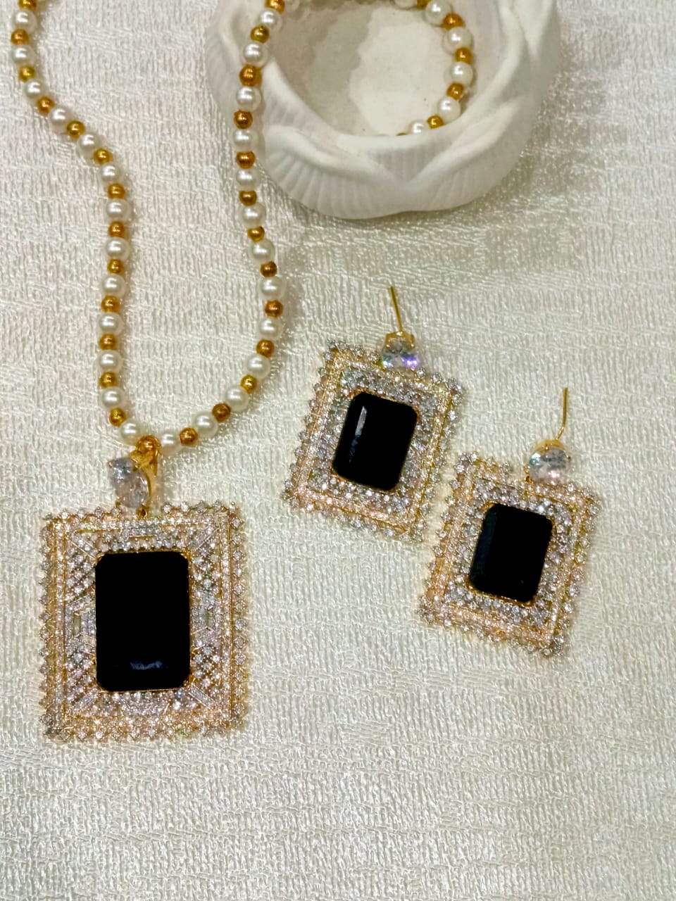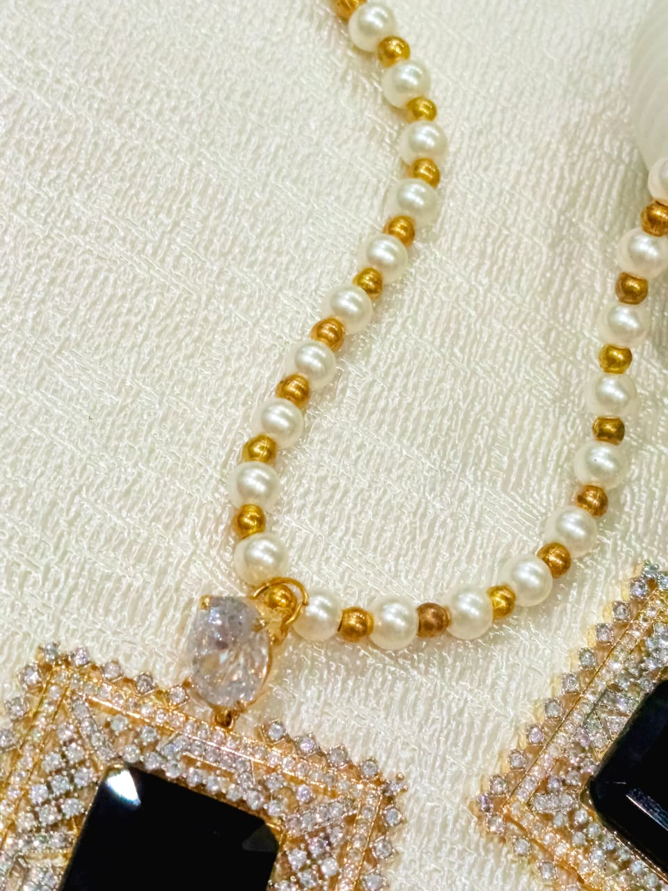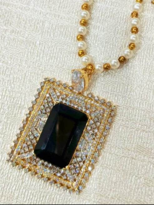 Shop the elegant Premium Black Crystal Studded Golden Tone Pendant Set. Perfect for parties, weddings, or gifting .High End Luxurious design Pendant With Elegant Pearl Chain.